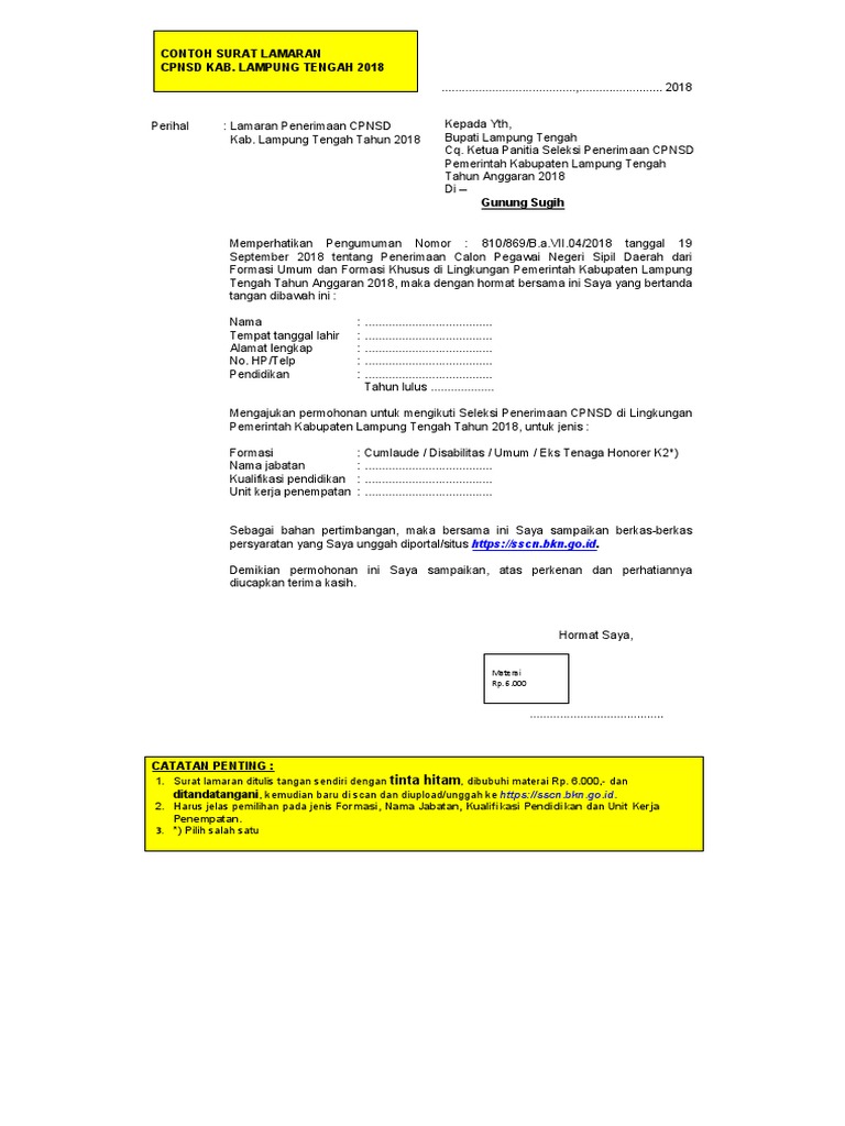 Contoh Surat Lamaran Cpns Lamteng
